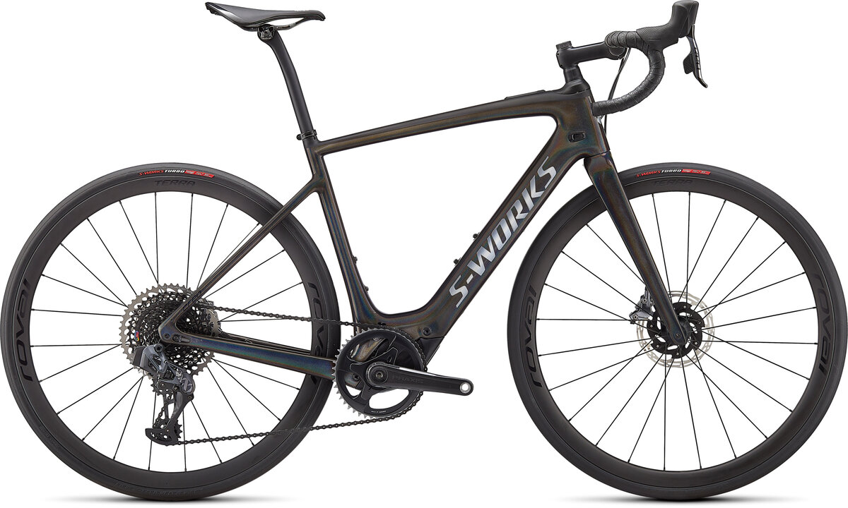 Like all of our S-Works bikes, the S-Works Turbo Creo SL is our pinnacle build. The FACT 11r chassis and Future Shock 2.0 with a hydraulic damper is dressed with a 1x build that includes SRAM Red AXS eTap, a SRAM XX1 Eagle rear derailleur, and a 10-50t cassette for an incredible gear range. It rolls on Roval Terra CLX EVO Disc carbon wheels and 30mm S-Works Turbo tires. And to finish off the build, we've included our S-Works Carbon Hover bars, an S-Works Future Stem, and a Body Geometry S-Works Power saddle. We're throwing in a range extender too, because you're never going to want to stop riding this bike.